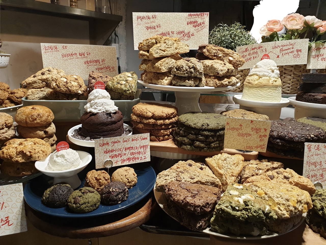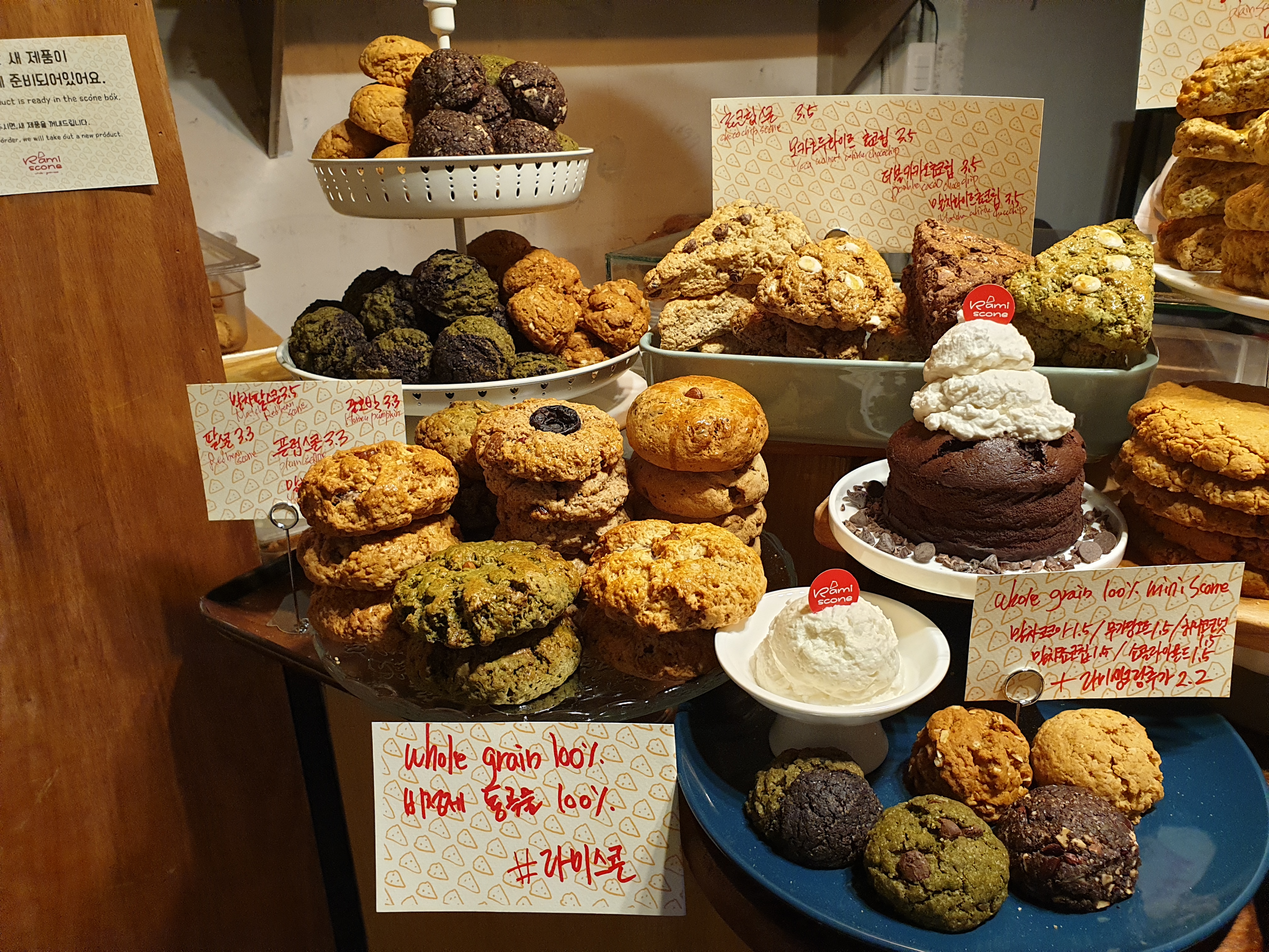 매장 밖에서 볼땐 몰랐는데 진열된 빵들을 가까이서 봐보니 종류가 다양하고 많았습니다. 매장 이름만 보고는 스콘만 있는줄 알았더니 쿠키, 케이크, 초코칩 등도 있습니다. 비주얼들은 울퉁불퉁한 정도가 과하지 않고 모양이 잘 잡혀 있으며 통곡물 빵 특유의 윤기가 흐릅니다. 그리고 빵에 박혀있는 큼직큼직한 부재료들은 절대 부실하다고 느껴지지 않을 정도입니다.